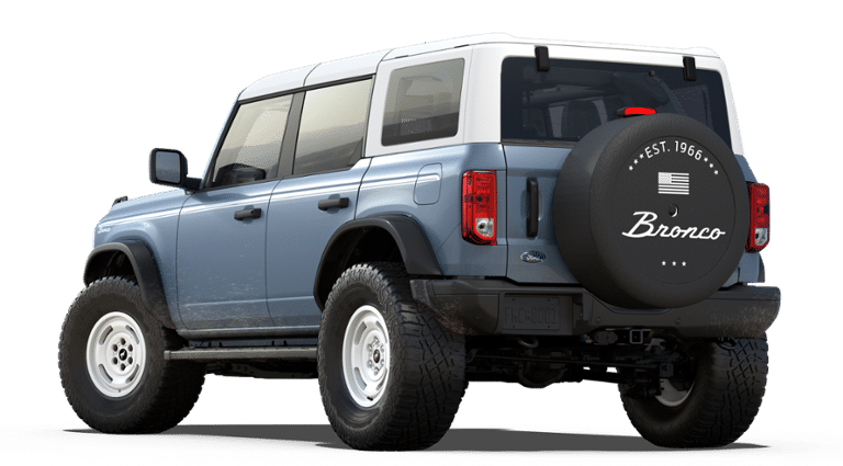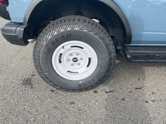 This 2025 Ford Bronco comes equipped with, 7 Speakers, AM/FM radio: SiriusXM with 360L, Auto High-beam Headlights, Brake assist, Convertible HardTop, Equipment Group 662A Mid Package, Exterior Parking Camera Rear, First Aid Kit, Glass rear window, Hard Top Sound Deadening Headliner, Heated front seats, Heated steering wheel, Illuminated entry, Navigation system: Connected Navigation, Trailer Tow Package (DIO), 4-Wheel Disc Brakes, ABS brakes, Air Conditioning, Alloy wheels, AM/FM Stereo, Auto-dimming Rear-View mirror, Automatic temperature control, Compass, Connected Navigation, Convertible roof lining, Delay-off headlights, Driver door bin, Driver vanity mirror, Dual front impact airbags, Dual front side impact airbags, Electronic Stability Control, Emergency communication system: 911 Assist, Front anti-roll bar, Front Bucket Seats, Front Center Armrest, Front dual zone A/C, Front fog lights, Front reading lights, Front wheel independent suspension, Fully automatic headlights, Heated door mirrors, Integrated roll-over protection, Leather Shift Knob, Low tire pressure warning, Occupant sensing airbag, Outside temperature display, Overhead airbag, Overhead console, Panic alarm, Passenger door bin, Passenger vanity mirror, Plaid Cloth Front Heated Bucket Seats, Power door mirrors, Power steering, Power windows, Radio data system, Rear window defroster, Rear window wiper, Remote keyless entry, Security system, SiriusXM w/360L, Speed control, Split folding rear seat, Steering wheel mounted audio controls, SYNC 4, Tachometer, Telescoping steering wheel, Tilt steering wheel, Traction control, Trip computer, Variably intermittent wipers, Wheels: 17 Unique White, HARD TOP, WHITE-PAINTED, 7 Speakers, AM/FM radio: SiriusXM with 360L, Auto High-beam Headlights, Brake assist, Convertible HardTop, Equipment Group 662A Mid Package, Exterior Parking Camera Rear, First Aid Kit, Glass rear window, Hard Top Sound Deadening Headliner, Heated front seats, Heated steering wheel, Illuminated entry, Navigation system: Connected Navigation, Trailer Tow Package (DIO). Azure Gray Metallic Tri-Coat 2025 Ford Bronco Heritage Edition 4WD 10-Speed Automatic 2.7L EcoBoost V6