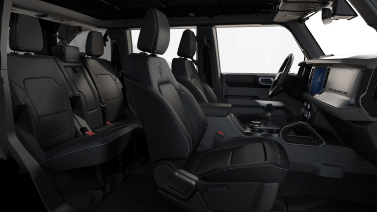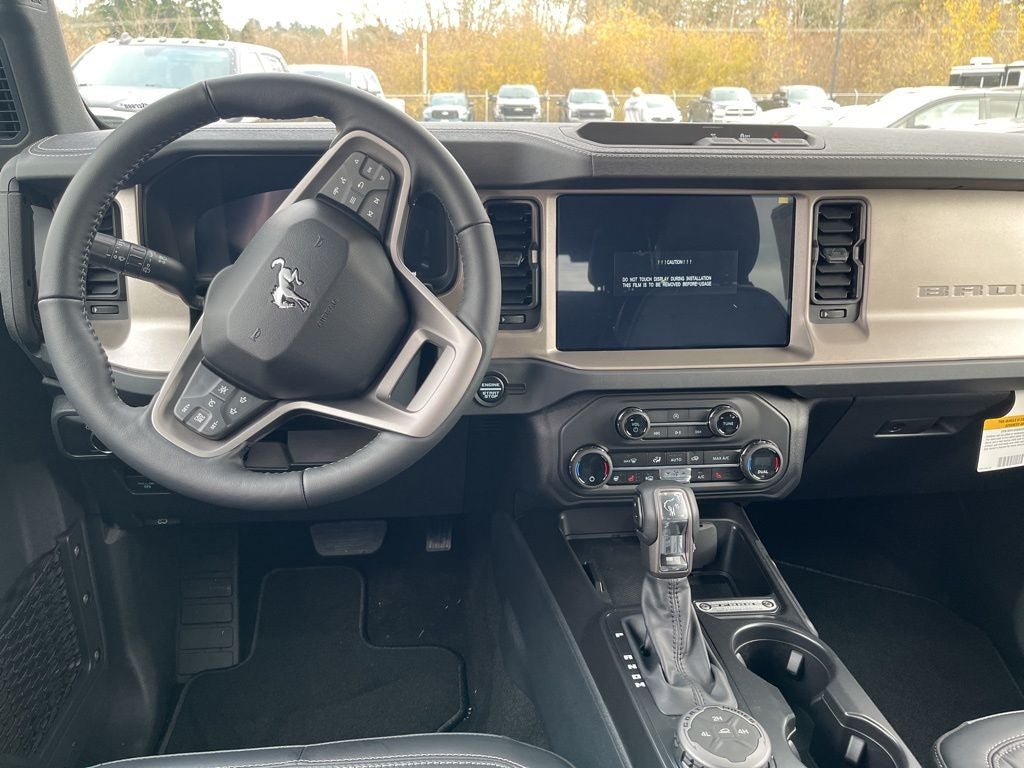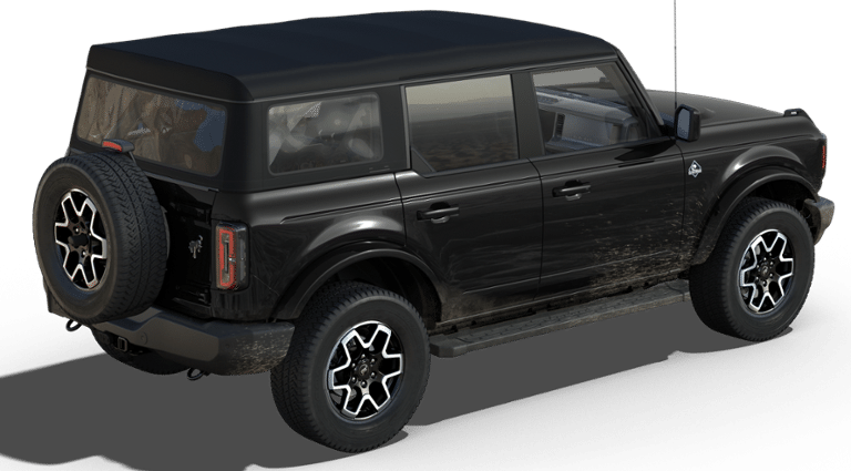 This 2025 Ford Bronco comes equipped with, 3.73 Axle Ratio, Auto High-beam Headlights, Auto-dimming Rear-View mirror, Brake assist, Connected Navigation, Electronic Stability Control, Equipment Group 312A Mid Package, Exterior Parking Camera Rear, First Aid Kit, Hard Top Sound Deadening Headliner, Heated Leather-Trimmed/Vinyl Bucket Seats, Heated steering wheel, Illuminated entry, Navigation system: Connected Navigation, Painted Hard Top, Power driver seat, Rear-Window Defroster & Washer, Shadow Black-Painted Hard Top, SYNC 4, Trailer Tow Package (DIO), 18 Bright Machined Aluminum Wheels, 4-Wheel Disc Brakes, 7 Speakers, ABS brakes, Air Conditioning, Alloy wheels, AM/FM radio: SiriusXM with 360L, AM/FM Stereo, Automatic temperature control, Compass, Delay-off headlights, Driver door bin, Driver vanity mirror, Dual front impact airbags, Dual front side impact airbags, Emergency communication system: 911 Assist, Front anti-roll bar, Front Bucket Seats, Front Center Armrest, Front dual zone A/C, Front fog lights, Front License Plate Bracket, Front reading lights, Front wheel independent suspension, Fully automatic headlights, Heated door mirrors, Heated front seats, Integrated roll-over protection, Leather Shift Knob, Low tire pressure warning, Occupant sensing airbag, Outside temperature display, Overhead airbag, Overhead console, Panic alarm, Passenger door bin, Passenger vanity mirror, Power door mirrors, Power passenger seat, Power steering, Power windows, Radio data system, Rear seat center armrest, Remote keyless entry, Security system, SiriusXM w/360L, Speed control, Split folding rear seat, Steering wheel mounted audio controls, Tachometer, Telescoping steering wheel, Tilt steering wheel, Traction control, Trip computer, Variably intermittent wipers, Voltmeter, 3.73 Axle Ratio, Auto High-beam Headlights, Auto-dimming Rear-View mirror, Brake assist, Connected Navigation, Electronic Stability Control, Equipment Group 312A Mid Package, Exterior Parking Camera Rear, First Aid Kit, Hard Top Sound Deadening Headliner, Heated Leather-Trimmed/Vinyl Bucket Seats, Heated steering wheel, Illuminated entry, Navigation system: Connected Navigation, Painted Hard Top, Power driver seat, Rear-Window Defroster & Washer, Shadow Black-Painted Hard Top, SYNC 4, Trailer Tow Package (DIO). Shadow Black 2025 Ford Bronco Outer Banks 4WD 10-Speed Automatic 2.7L EcoBoost V6