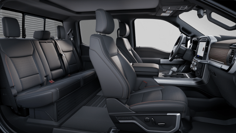 This 2025 Ford F-150 comes equipped with, 3.5L PowerBoost Full-Hybrid V6, 4WD, 4 Pickup Box Tie-Down Plates, 4-Wheel Disc Brakes, 4x4 FX4 Off-Road Bodyside Decal, 6 Extended Running Boards, 8 Speakers, ABS brakes, ActiveX Trimmed Bucket Seats, Adjustable pedals, Air Conditioning, Alloy wheels, AM/FM radio: SiriusXM with 360L, Auto High-beam Headlights, Auto-dimming door mirrors, Auto-dimming Rear-View mirror, Automatic temperature control, Bed Utility Package, Brake assist, Bumpers: chrome, Chrome wheels, Compass, Delay-off headlights, Driver door bin, Driver vanity mirror, Dual front impact airbags, Dual front side impact airbags, Electronic Stability Control, Emergency communication system: SYNC 4 911 Assist, Equipment Group 502A High, Front anti-roll bar, Front Bucket Seats, Front Center Armrest, Front dual zone A/C, Front fog lights, Front License Plate Bracket, Front reading lights, Front wheel independent suspension, Fully automatic headlights, FX4 Off-Road Package, Garage door transmitter, Heated door mirrors, Heated front seats, Heated steering wheel, Hill Descent Control, Illuminated entry, Internet access capable: FordPass Connect 5G, LED Box Lighting, Low tire pressure warning, Memory seat, Monotube Rear Shocks, Navigation system: Connected Navigation, Occupant sensing airbag, Off-Road Tuned Front Shock Absorbers, Outside temperature display, Overhead airbag, Overhead console, Panic alarm, Passenger door bin, Passenger vanity mirror, Pedal memory, Power door mirrors, Power driver seat, Power passenger seat, Power steering, Power Tailgate, Power Telescoping/Glass/Folding Trailer Tow Mirrors, Power windows, Pro Access Tailgate, Pro Power Onboard - 7.2KW, Radio data system, Radio: B&O Sound System by Bang & Olufsen, Rain sensing wipers, Rear reading lights, Rear seat center armrest, Rear step bumper, Rear window defroster, Remote keyless entry, Rock Crawl Mode, Security system, Speed control, Split folding rear seat, Steering wheel mounted audio controls, SYNC 4 w/Enhanced Voice Recognition, Tachometer, Telescoping steering wheel, Tilt steering wheel, Tow/Haul Package, Traction control, Tray Style Floor Liner w/o Carpet Mats, Trip computer, Turn signal indicator mirrors, Twin Panel Moonroof, Variably intermittent wipers, Ventilated front seats, Voltmeter, Wheels: 18 Chrome-Like PVD, Wheels: 20 Chrome-Like PVD, 3.5L PowerBoost Full-Hybrid V6, 4WD. Black Metallic 2025 Ford F-150 Lariat 4WD 10-Speed Automatic 3.5L PowerBoost Full-Hybrid V6