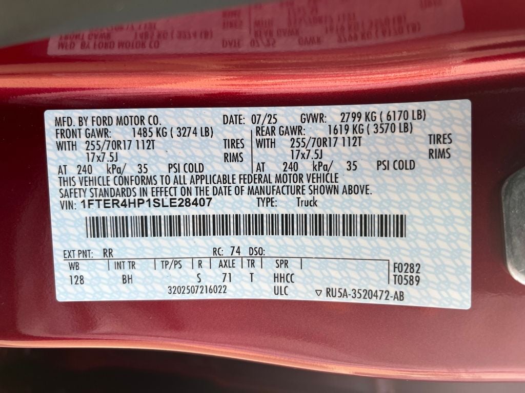 This 2025 Ford Ranger comes equipped with, 4WD, 360-Degree Camera, 6 Speakers, Adaptive Cruise Control, Auto High-beam Headlights, Black Running Boards, Equipment Group 300A Standard, First Aid Kit, Front Parking Sensors, Gray Painted Center Bar & Grille Surround, Gray Painted Front Fascia & Rear Bumper, Illuminated entry, Navigation system: Connected Navigation, Road Side Assistance Kit (DIO), Sport Appearance Package, Sport Box Decal, SYNC 4A w/Connected Navigation, Technology Package, Tray Style Floor Liner, Wheels: 17 Gray-Painted Aluminum, 3.73 Axle Ratio, 4-Wheel Disc Brakes, ABS brakes, Air Conditioning, Alloy wheels, AM/FM radio: SiriusXM, AM/FM Stereo, Auto-dimming Rear-View mirror, Brake assist, Cloth Front Bucket Seats, Compass, Delay-off headlights, Driver door bin, Driver vanity mirror, Dual front impact airbags, Dual front side impact airbags, Electronic Stability Control, Emergency communication system: SYNC 4 911 Assist, Front anti-roll bar, Front Bucket Seats, Front Center Armrest, Front fog lights, Front License Plate Bracket, Front reading lights, Front wheel independent suspension, Fully automatic headlights, Leather Shift Knob, Low tire pressure warning, Occupant sensing airbag, Outside temperature display, Overhead airbag, Overhead console, Panic alarm, Passenger door bin, Passenger vanity mirror, Power door mirrors, Power steering, Power windows, Rear reading lights, Rear seat center armrest, Rear step bumper, Rear window defroster, Remote keyless entry, Security system, SiriusXM Satellite Radio, Speed control, Speed-sensing steering, Steering wheel mounted audio controls, Telescoping steering wheel, Tilt steering wheel, Traction control, Trip computer, Variably intermittent wipers, Voltmeter, 4WD, 360-Degree Camera, 6 Speakers, Adaptive Cruise Control, Auto High-beam Headlights, Black Running Boards, Equipment Group 300A Standard, First Aid Kit, Front Parking Sensors, Gray Painted Center Bar & Grille Surround, Gray Painted Front Fascia & Rear Bumper, Illuminated entry, Navigation system: Connected Navigation, Road Side Assistance Kit (DIO), Sport Appearance Package, Sport Box Decal, SYNC 4A w/Connected Navigation, Technology Package, Tray Style Floor Liner, Wheels: 17 Gray-Painted Aluminum. Ruby Red Metallic 2025 Ford Ranger XLT 4WD 10-Speed Automatic 2.7L EcoBoost V6