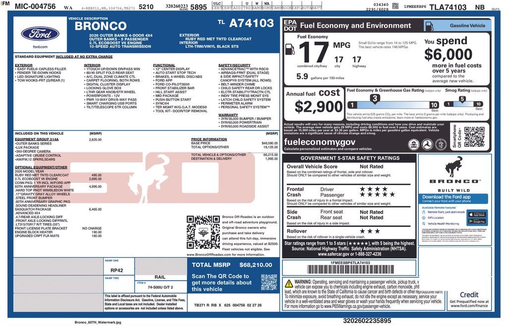 This 2026 Ford Bronco comes equipped with, 18 Bright Machined Aluminum Wheels, 360-Degree Camera, 4.7 Final Drive Ratio, 60th Anniversary Package, Adaptive Cruise Control, Black Molded-in-Color Door Handles, Equipment Group 314A Lux Package, Evasive Steering Assist, Ford Connectivity Package (1-Year Included), Front Parking Sensors, Hard Top Sound Deadening Headliner, Heated Leather-Trimmed/Vinyl Bucket Seats, High Clearance Fender Flares, High Clearance Suspension, Information on Demand Panel, Leather-Trimmed/Vinyl Bucket Seats, Navigation system: Connected Navigation, Painted Door Handles, Position-Sensitive Bilstein Shock Absorbers, Radio: B&O Sound System by Bang and Olufsen, Sasquatch Package, Sideview Mirrors, Steel Front Bumper, Warm Alloy Grille, Wheels: 17 Gravity Gray-Painted Alloy, Wheels: 17 Matte Black Alloy, Wimbledon White-Painted Hard Top, 4-Wheel Disc Brakes, 7 Speakers, ABS brakes, Air Conditioning, Alloy wheels, AM/FM radio: SiriusXM with 360L, AM/FM Stereo, Auto High-beam Headlights, Auto-dimming Rear-View mirror, Automatic temperature control, Brake assist, Compass, Connected Navigation, Delay-off headlights, Driver door bin, Driver vanity mirror, Dual front impact airbags, Dual front side impact airbags, Electronic Stability Control, Emergency communication system: 911 Assist, Engine Block Heater, Exterior Parking Camera Rear, Front anti-roll bar, Front Bucket Seats, Front Center Armrest, Front dual zone A/C, Front fog lights, Front License Plate Bracket, Front reading lights, Front wheel independent suspension, Fully automatic headlights, Heated door mirrors, Heated front seats, Heated steering wheel, Illuminated entry, Integrated roll-over protection, Leather Shift Knob, Low tire pressure warning, Occupant sensing airbag, Outside temperature display, Overhead airbag, Overhead console, Panic alarm, Passenger door bin, Passenger vanity mirror, Power door mirrors, Power driver seat, Power passenger seat, Power steering, Power windows, Radio data system, Rear seat center armrest, Remote keyless entry, Security system, SiriusXM with 360L, Speed control, Split folding rear seat, Steering wheel mounted audio controls, SYNC 4, Tachometer, Telescoping steering wheel, Tilt steering wheel, Traction control, Trip computer, Upgraded Carpet Floor Mats, Variably intermittent wipers, Voltmeter, 18 Bright Machined Aluminum Wheels, 360-Degree Camera, 4.7 Final Drive Ratio, 60th Anniversary Package, Adaptive Cruise Control, Black Molded-in-Color Door Handles, Equipment Group 314A Lux Package, Evasive Steering Assist, Ford Connectivity Package (1-Year Included), Front Parking Sensors, Hard Top Sound Deadening Headliner, Heated Leather-Trimmed/Vinyl Bucket Seats, High Clearance Fender Flares, High Clearance Suspension, Information on Demand Panel, Leather-Trimmed/Vinyl Bucket Seats, Navigation system: Connected Navigation, Painted Door Handles, Position-Sensitive Bilstein Shock Absorbers, Radio: B&O Sound System by Bang and Olufsen, Sasquatch Package, Sideview Mirrors, Steel Front Bumper, Warm Alloy Grille, Wheels: 17 Gravity Gray-Painted Alloy, Wheels: 17 Matte Black Alloy, Wimbledon White-Painted Hard Top. Ruby Red Metallic 2026 Ford Bronco Outer Banks 4WD 10-Speed Automatic 2.7L EcoBoost V6