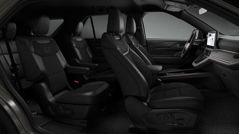 This 2026 Ford Explorer comes equipped with, 4WD, 10 Speakers, 3rd row seats: bench, 4-Wheel Disc Brakes, ABS brakes, Air Conditioning, Alloy wheels, AM/FM radio: SiriusXM with 360L, Apple CarPlay/Android Auto, Auto High-beam Headlights, Auto-dimming door mirrors, Auto-dimming Rear-View mirror, Automatic temperature control, Brake assist, Bumpers: body-color, Compass, Delay-off headlights, Driver door bin, Driver vanity mirror, Dual front impact airbags, Dual front side impact airbags, Electronic Stability Control, Emergency communication system: 911 Assist, Exterior Parking Camera Rear, Four wheel independent suspension, Front anti-roll bar, Front Bucket Seats, Front Center Armrest, Front dual zone A/C, Front fog lights, Front reading lights, Fully automatic headlights, Garage door transmitter, Heated door mirrors, Heated front seats, Heated rear seats, Heated steering wheel, Heated/Ventilated Miko Suede Captain's Chairs, Illuminated entry, Knee airbag, Leather steering wheel, Low tire pressure warning, Memory seat, Navigation System, Occupant sensing airbag, Outside temperature display, Overhead airbag, Overhead console, Panic alarm, Passenger door bin, Passenger vanity mirror, Power door mirrors, Power driver seat, Power Liftgate, Power passenger seat, Power steering, Power windows, Radio: B&O Sound System by Bang and Olufsen, Rain sensing wipers, Rear air conditioning, Rear anti-roll bar, Rear reading lights, Rear window defroster, Rear window wiper, Remote keyless entry, Security system, Speed control, Speed-sensing steering, Speed-Sensitive Wipers, Split folding rear seat, Spoiler, Sport steering wheel, Steering wheel mounted audio controls, Tachometer, Telescoping steering wheel, Tilt steering wheel, Traction control, Trip computer, Turn signal indicator mirrors, Variably intermittent wipers, Ventilated front seats, Wheels: 21 Magnetite-Painted Aluminum, 4WD. 2026 Ford Explorer ST 4WD 10-Speed Automatic 3.0L EcoBoost V6