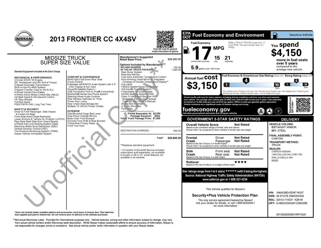 We're confident that this 2013 Nissan Frontier SV will exceed your expectations. Stop by our showroom today and let us demonstrate all that this capable and well-equipped truck has to offer. We're here to help you find the perfect vehicle to fit your lifestyle and budget.