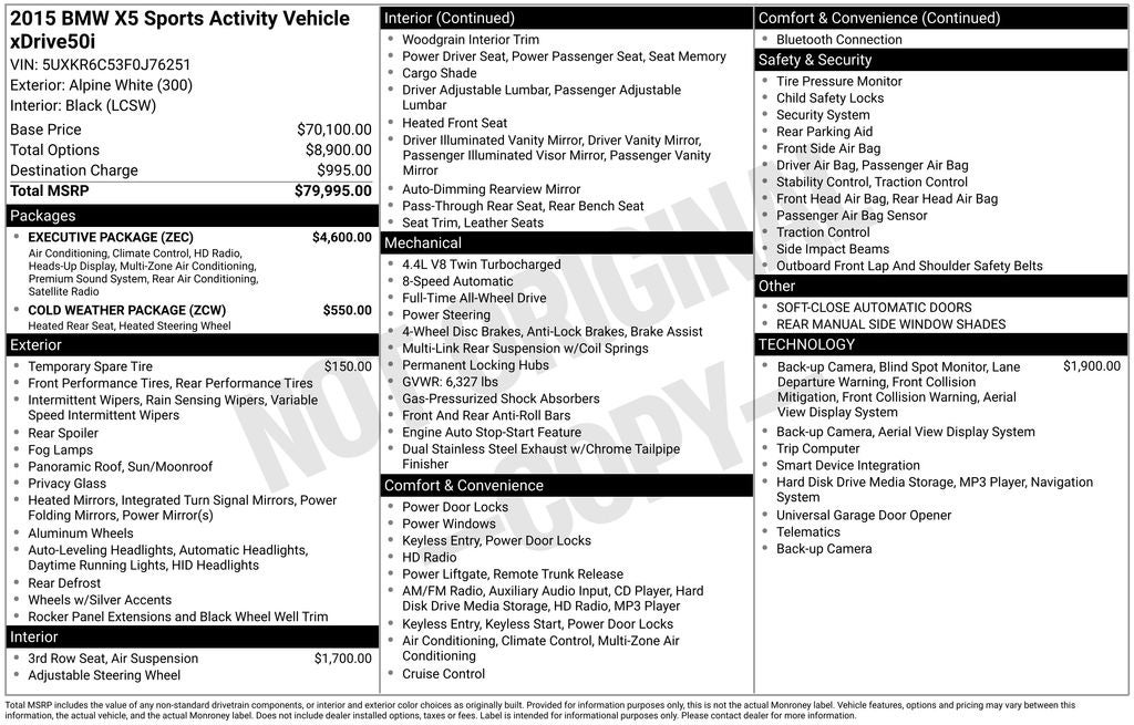With a sleek White exterior and an EPA-estimated 22 MPG on the highway, this 2015 BMW X5 xDrive50i combines power, luxury, and efficiency in a stunning package. We invite you to experience this exceptional vehicle firsthand and discover why it's the perfect choice for your next adventure.