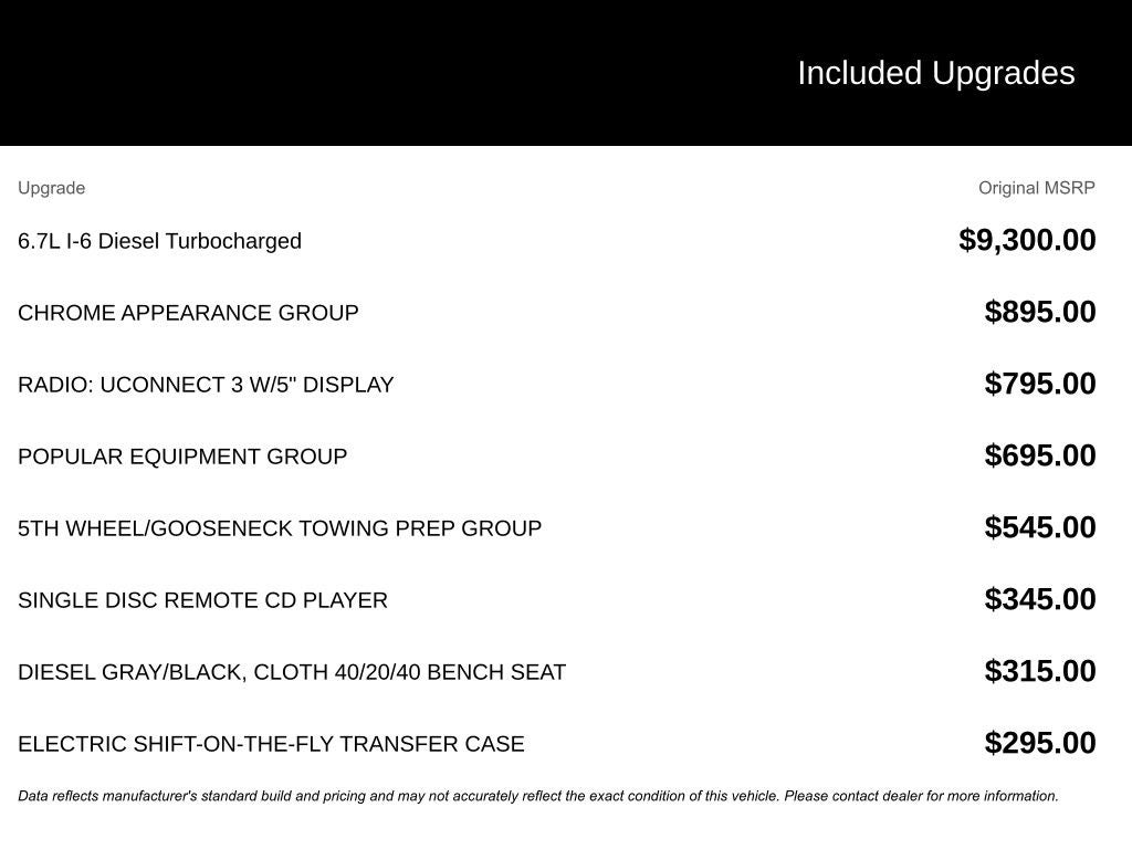 The interior of this Ram 3500 Tradesman is designed with your comfort and convenience in mind. The Diesel Gray/Black Cloth 40/20/40 Bench Seat provides ample room and support, while the Remote Keyless Entry and Power Windows make it easy to access and control your vehicle. The Uconnect 3 infotainment system with a 5-inch display keeps you connected and entertained on the go.