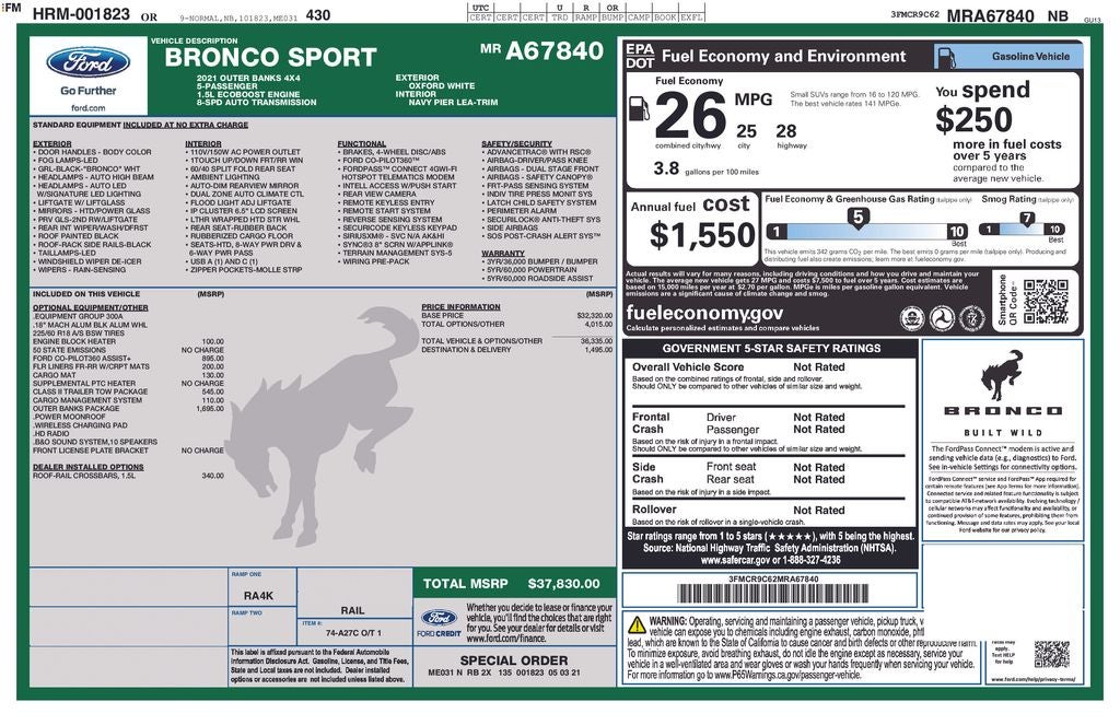 This 2021 Ford Bronco Sport Outer Banks is a true adventure-ready SUV that combines rugged capability with sophisticated style and technology. Boasting a powerful 1.5L EcoBoost engine, 4WD, and an impressive 25 city/28 highway MPG, this Bronco Sport is ready to tackle any road or trail with confidence.