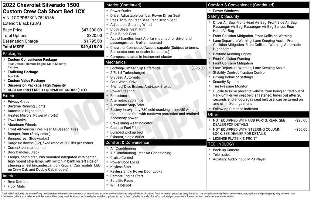 With its bold Black exterior and well-appointed interior, this Silverado 1500 Custom makes a strong statement on the road. The 20-inch Bright Silver Painted Aluminum wheels and deep-tinted glass add a touch of sophisticated style, while the front recovery hooks and Hitch Guidance system ensure you're ready for any adventure.