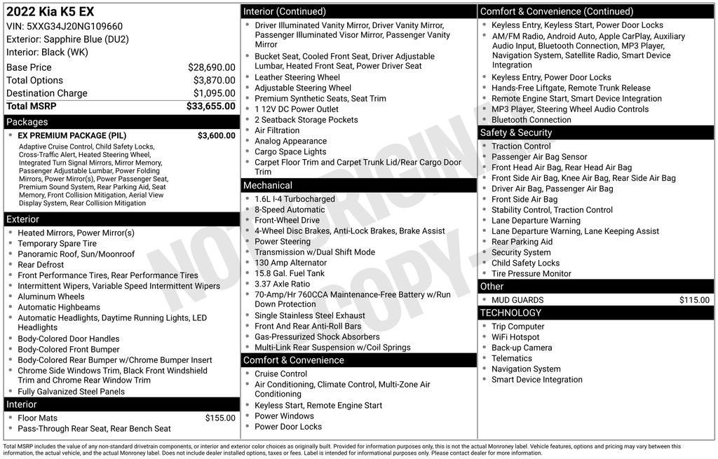 This 2022 Kia K5 EX is a true standout, packed with an impressive array of premium features that elevate the driving experience. Highlighted by the - *LOCAL TRADE IN*, this K5 EX comes equipped with the EX PREMIUM PACKAGE, which includes the Bose Premium Audio system, Surround View Monitor, Smart Cruise Control with Stop & Go, and much more. The eye-catching Blue exterior complements the well-appointed interior, offering a blend of style and sophistication.