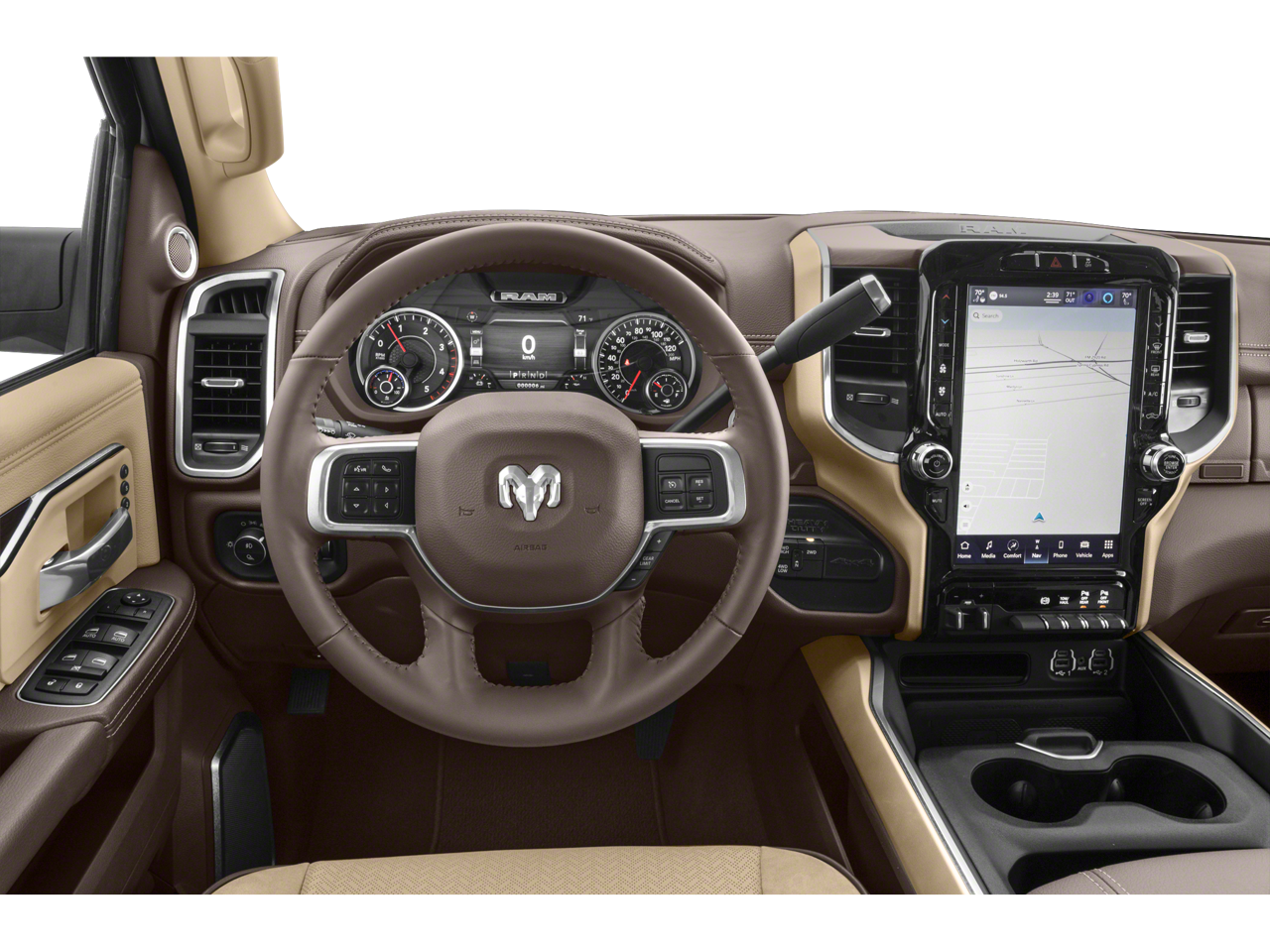 The exterior of this Big Horn model boasts a stylish Blue paint color, complemented by the 18-inch polished aluminum wheels and chrome accents. The interior features premium cloth bucket seats, a leather-wrapped steering wheel, and a state-of-the-art Uconnect 5 infotainment system with an 8.4-inch display, navigation, and SiriusXM satellite radio.