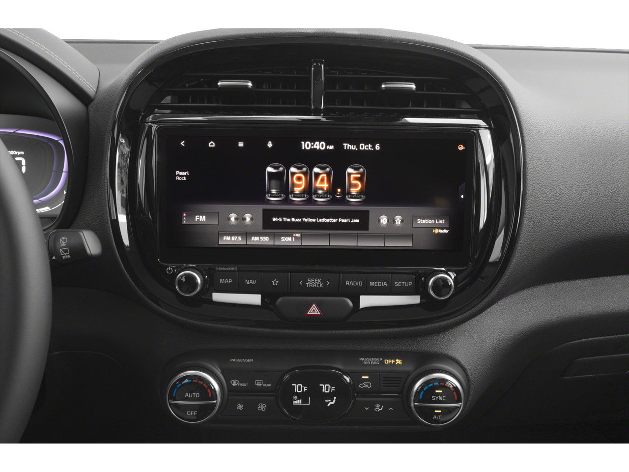 - Radio: AM/FM/MP3/HD Audio System -inc: UVO link, navigation, SiriusXM, 10.25" color touch screen, 6 speakers, support for Android Auto and Apple CarPlay, USB input, audio remote control, Bluetooth hands-free w/voice recognition and black shark fine type antenna