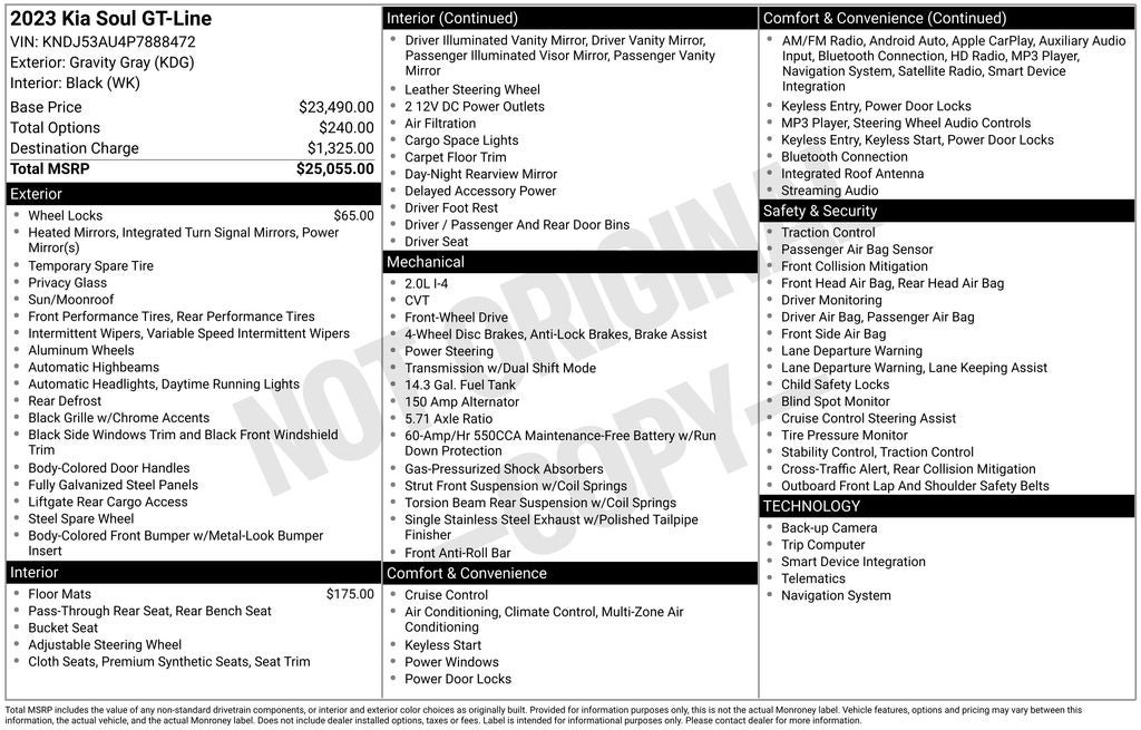 Powered by a 2.0L I4 DOHC engine and equipped with a CVT transmission, this Kia Soul GT-Line delivers a smooth and efficient driving experience. With an impressive 28 city and 33 highway MPG, you'll enjoy the freedom to explore the open road without frequent stops at the pump.